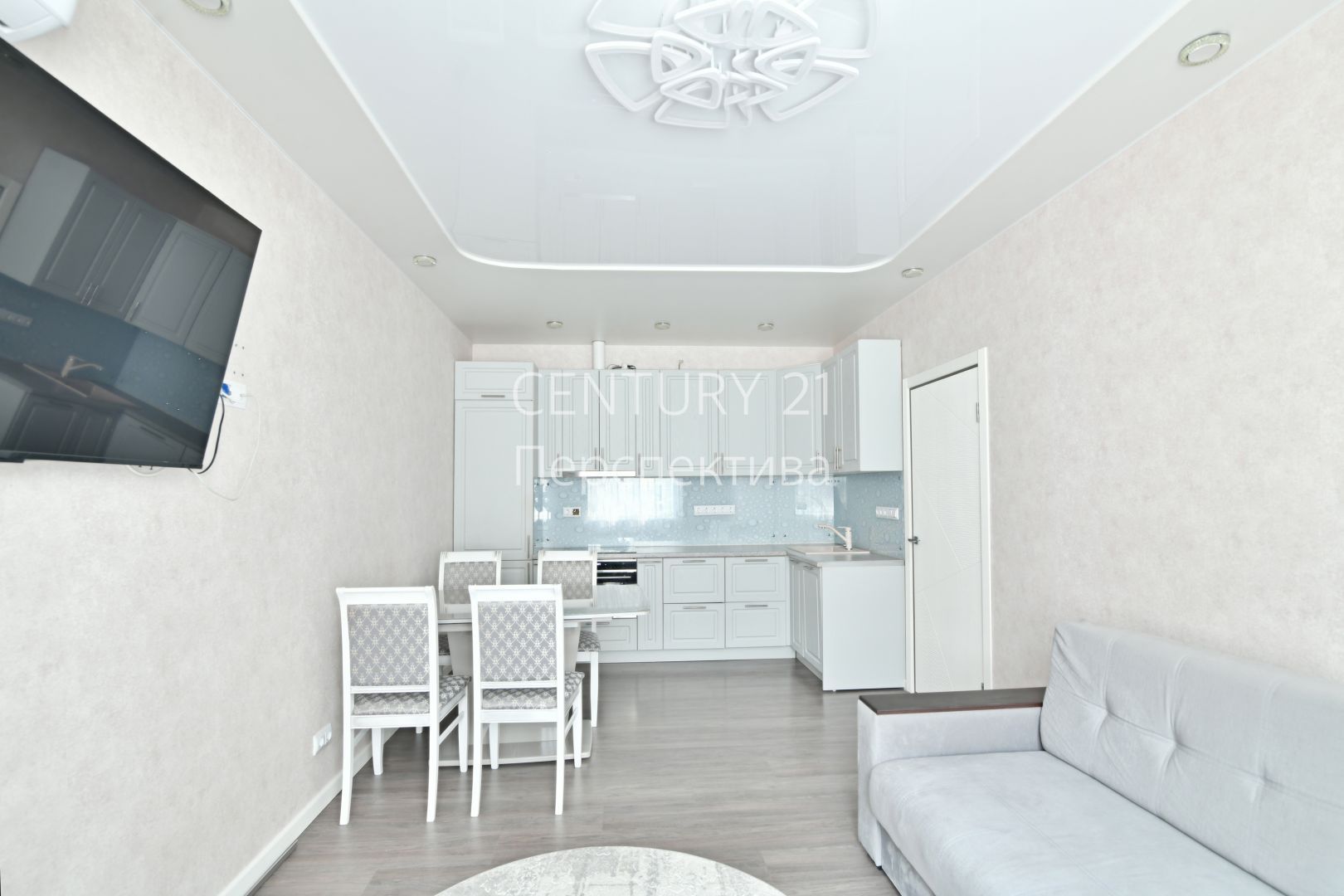 Светлая квартира с просторной жилой зоной и оборудованной кухней.